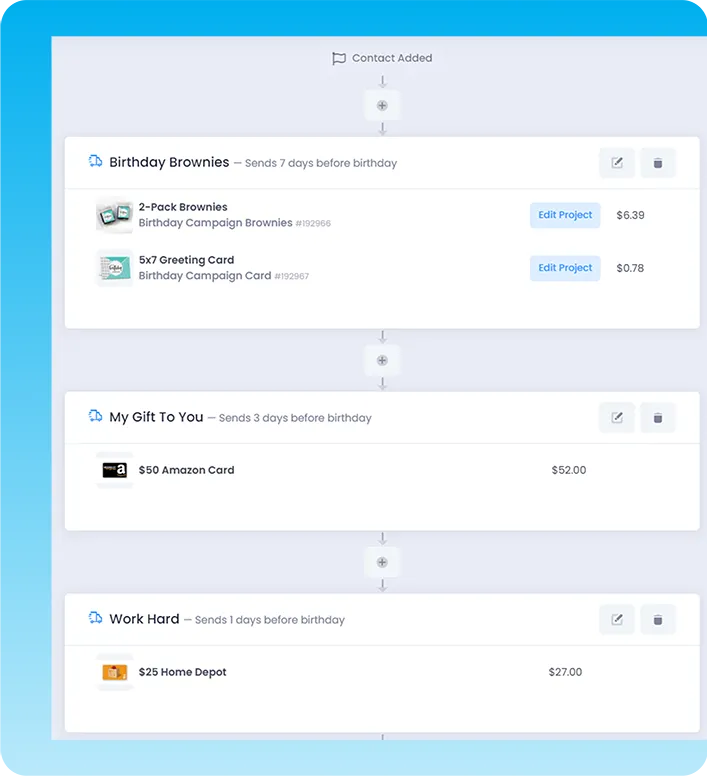 With our automated system, you can effortlessly create and schedule campaigns that deliver cards and gifts to your leads and customers right when they matter most.